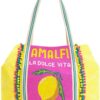 - Front features tropical sequin detailing with a Parrot and floral appliques. Tropical fabric top boarder and wrapped handles.