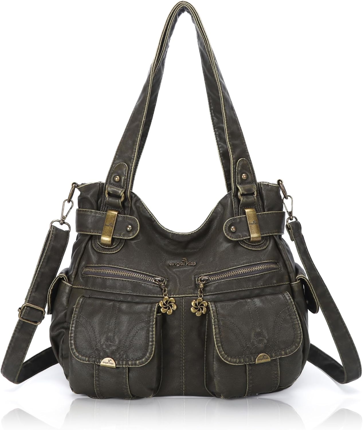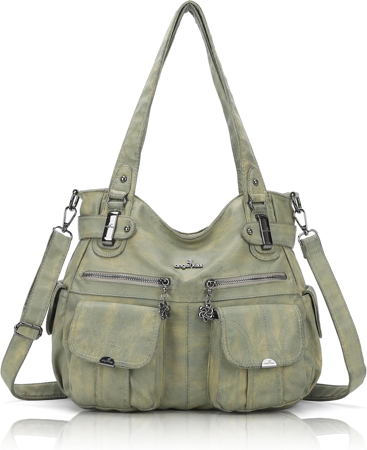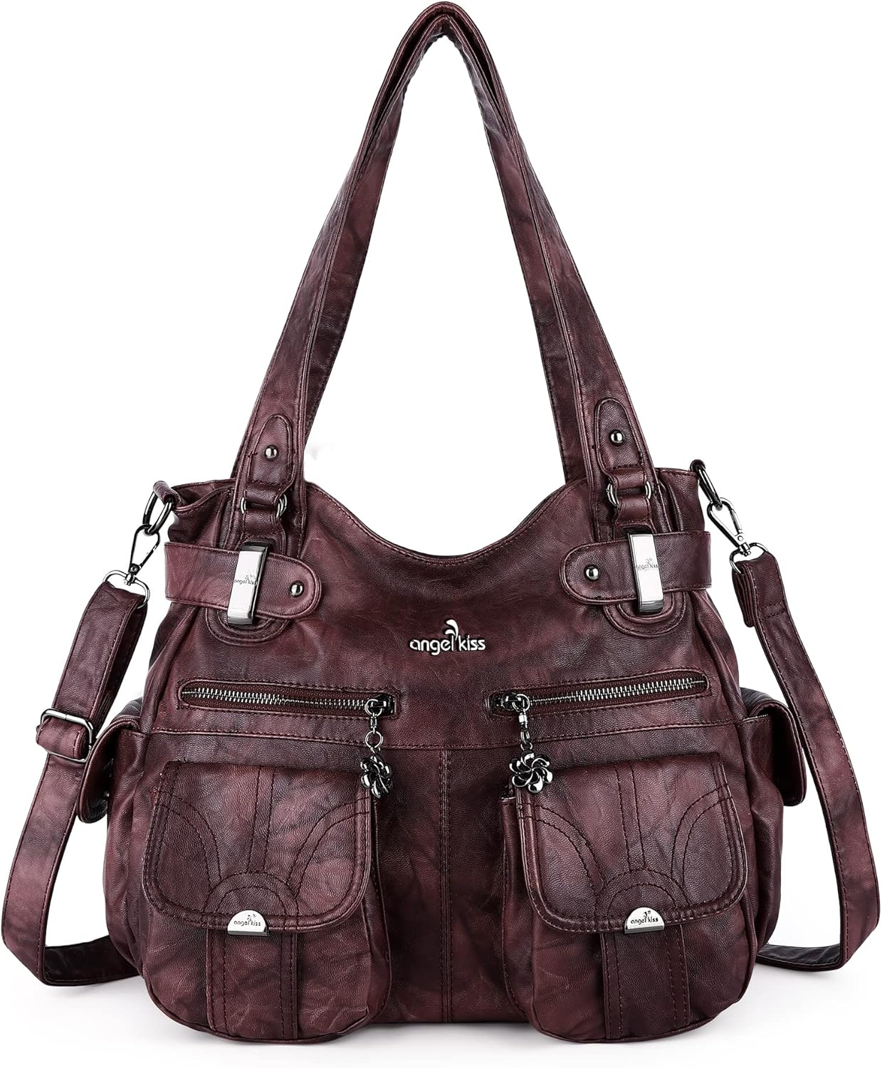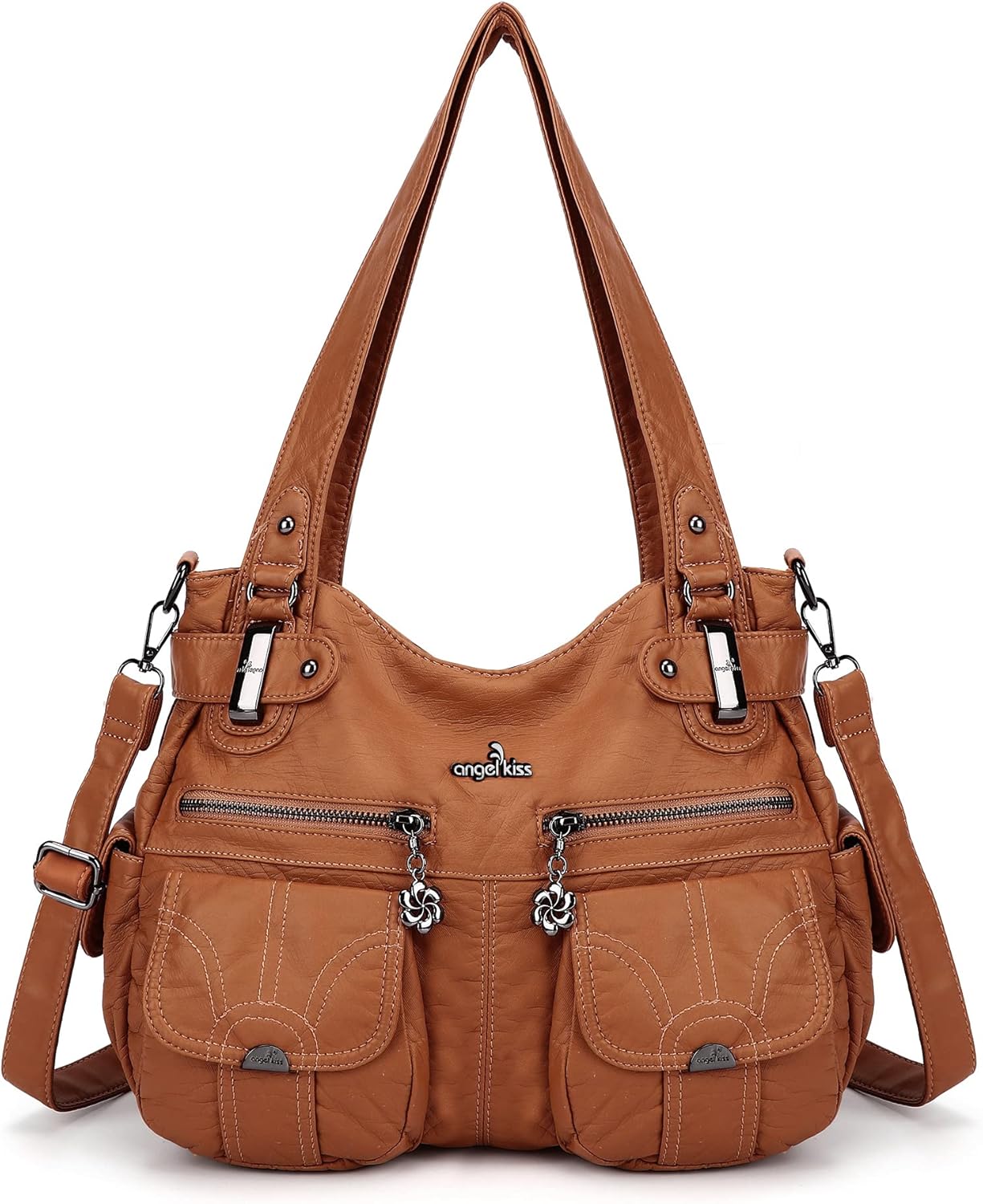 Angelkiss Women’s Designer Handbag Large Double Zipper Multi Pocket Washed Leather Purse