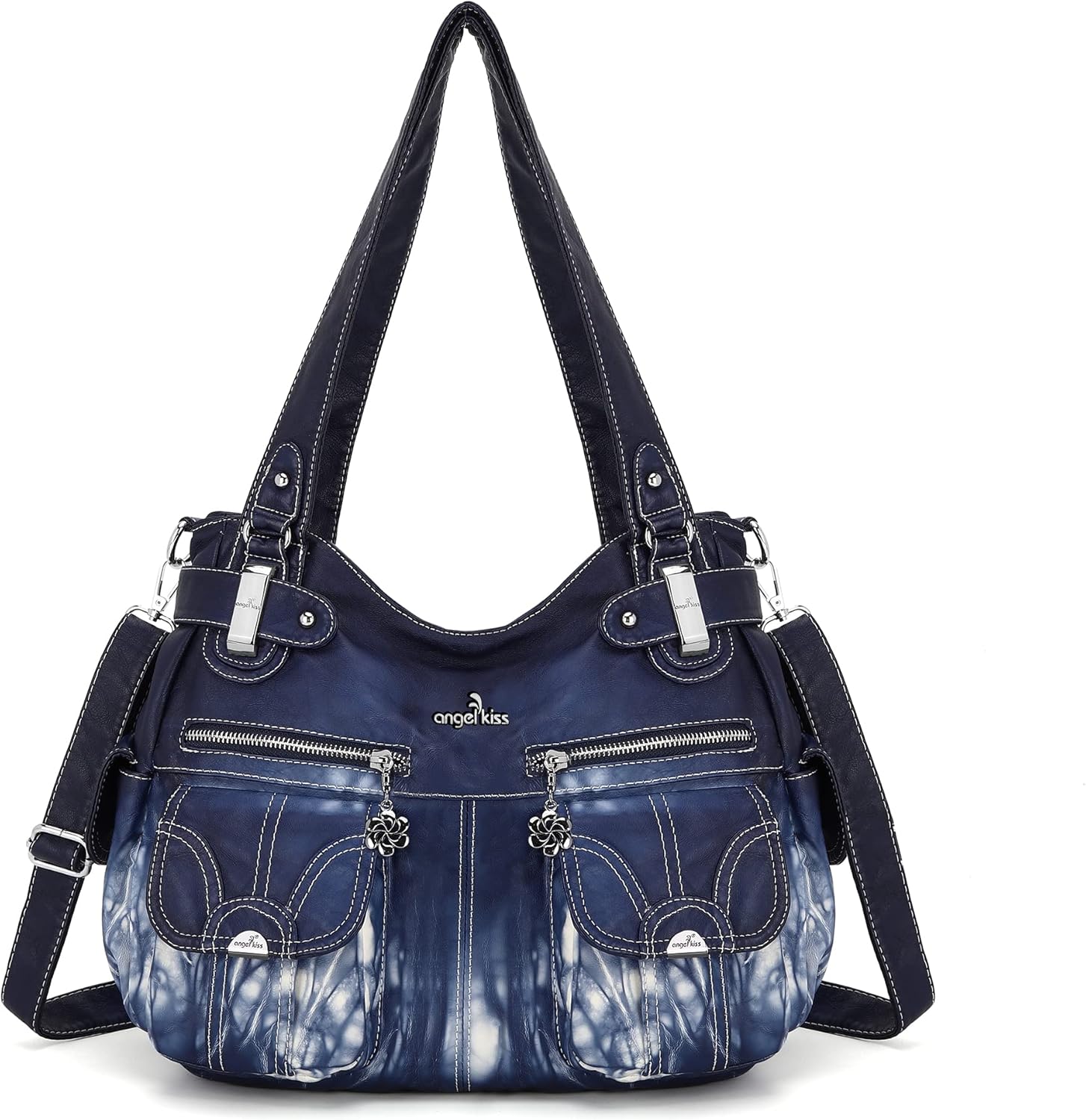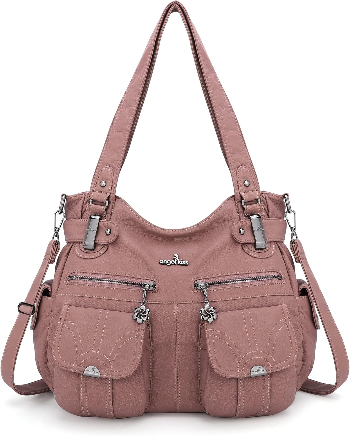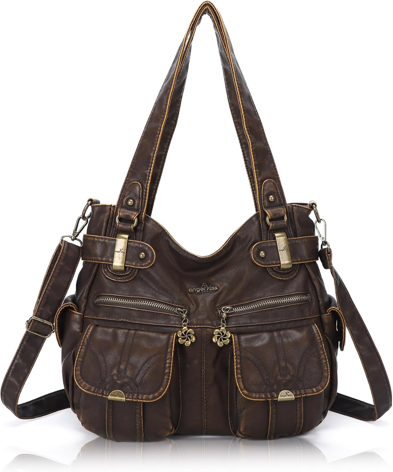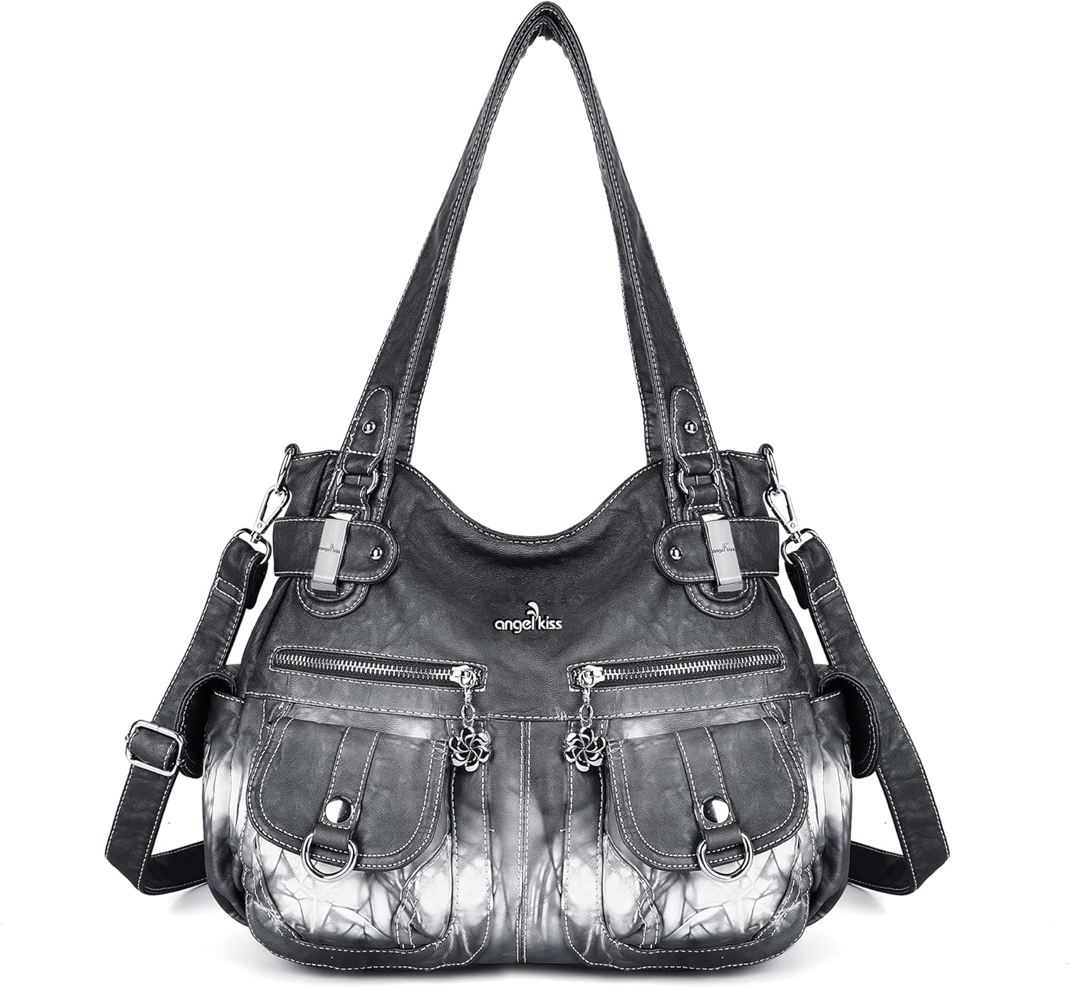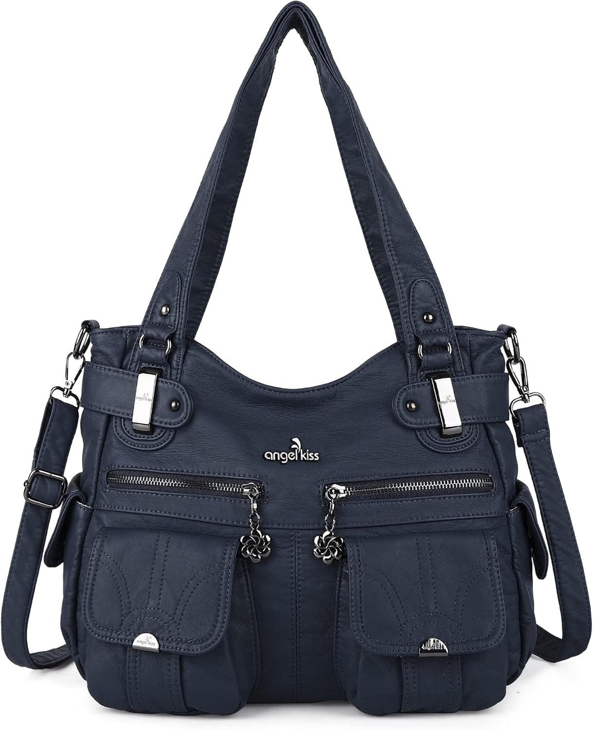 Angelkiss Women’s Designer Handbag Large Double Zipper Multi Pocket Washed Leather Purse