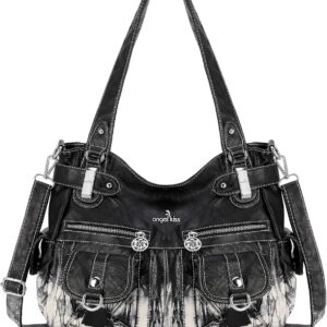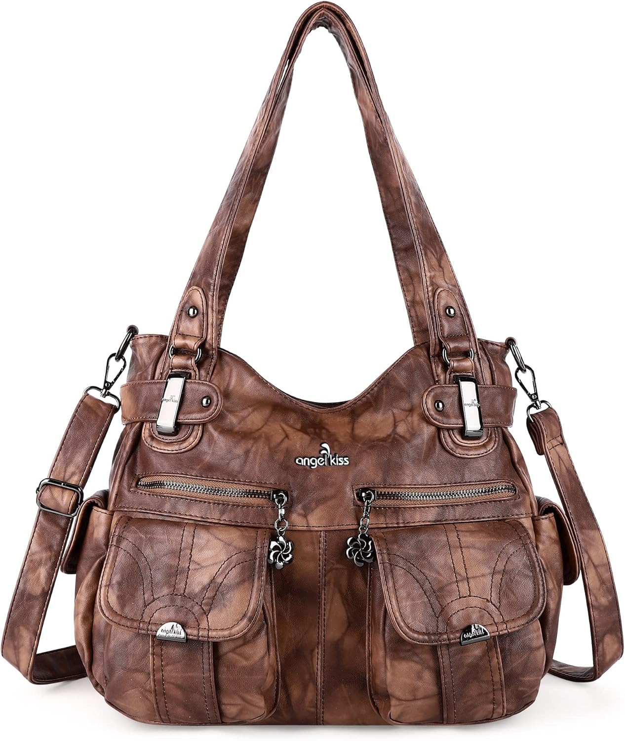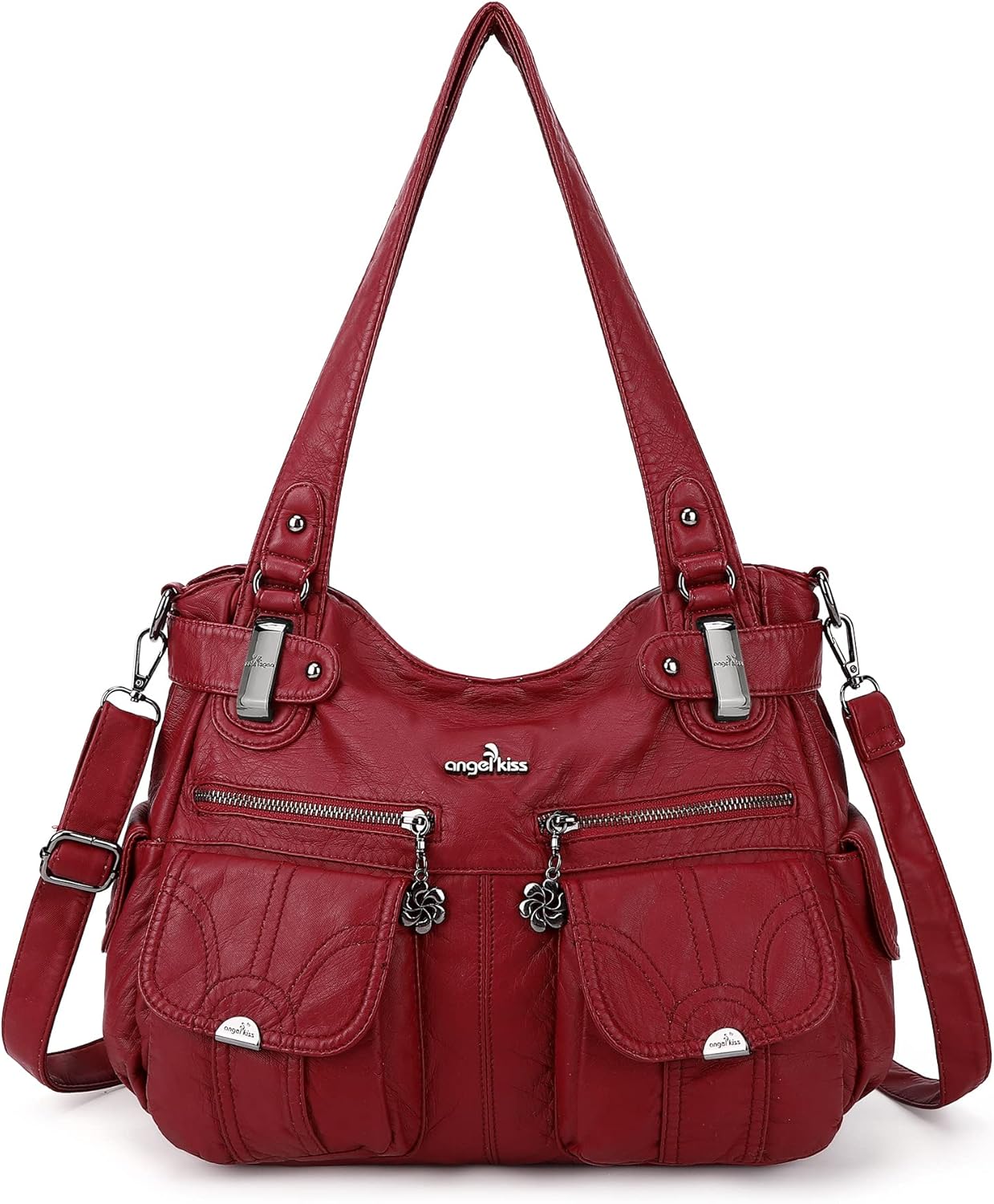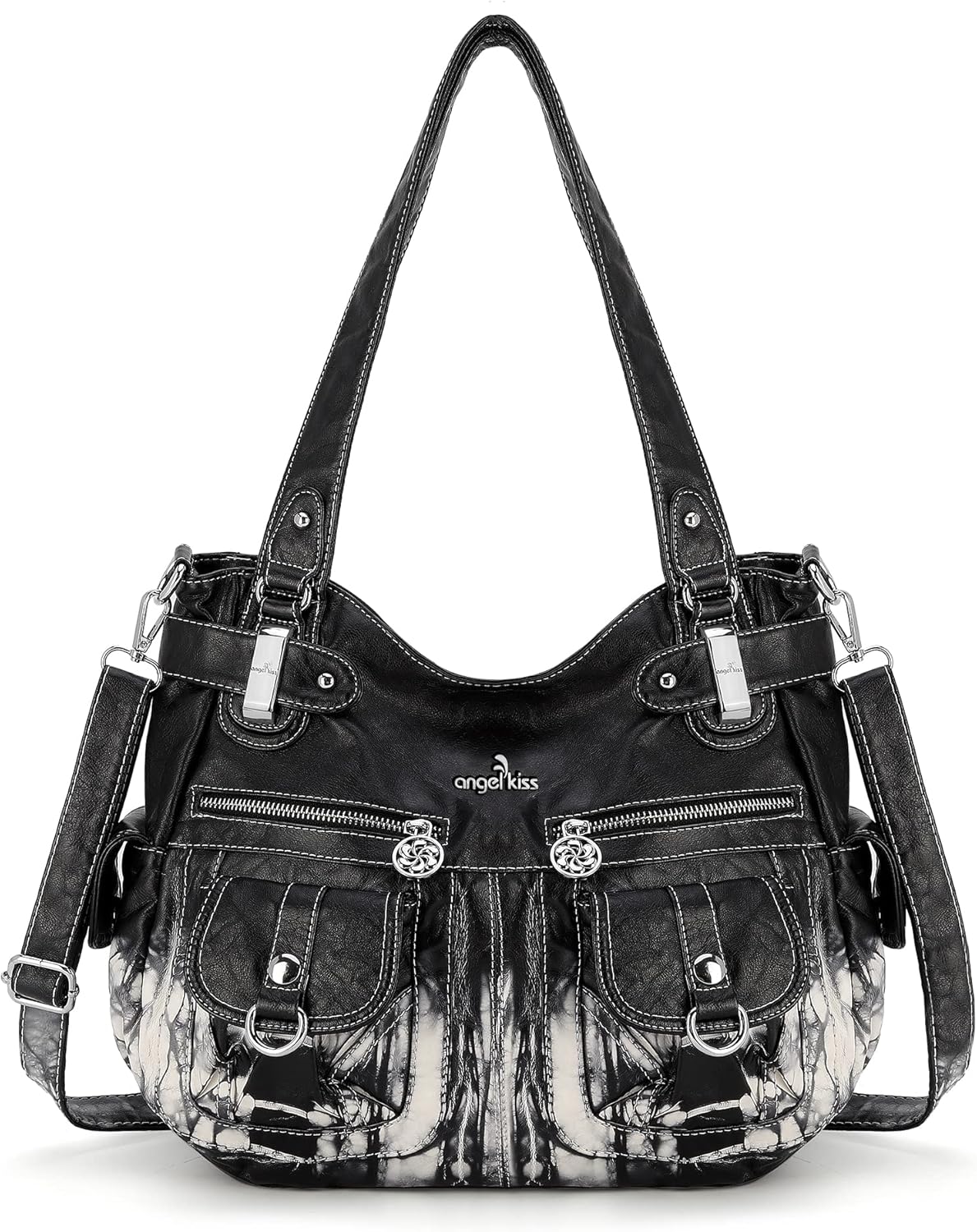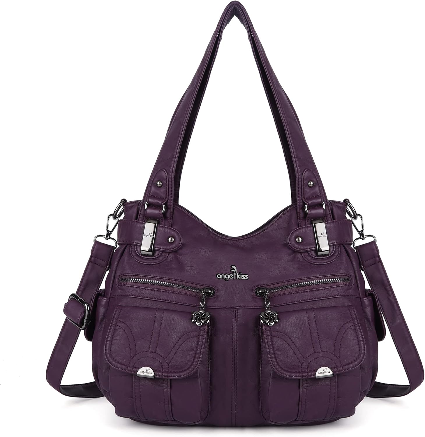 Angelkiss Women’s Designer Handbag Large Double Zipper Multi Pocket Washed Leather Purse