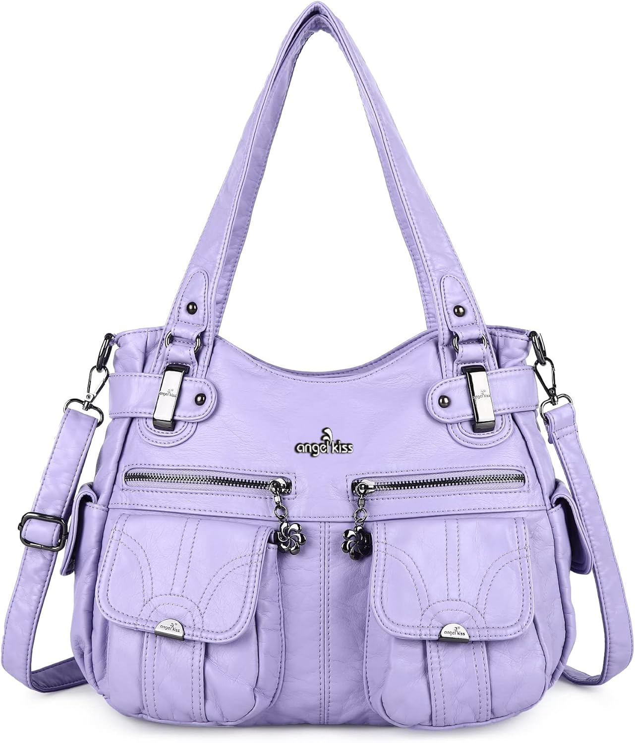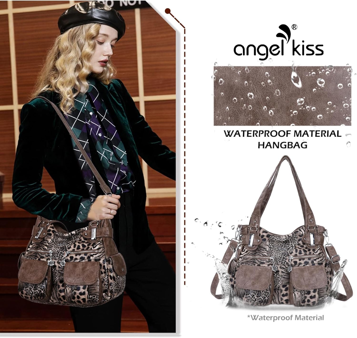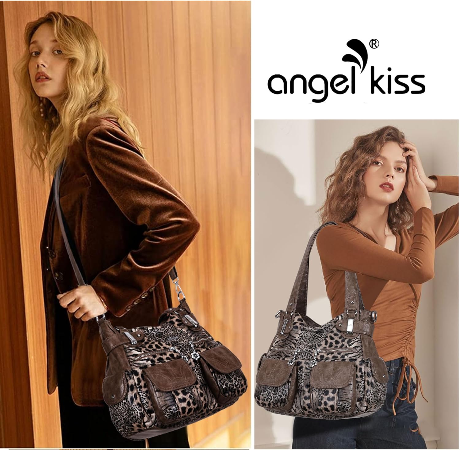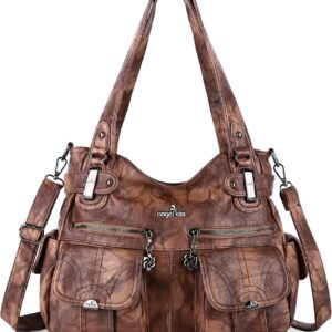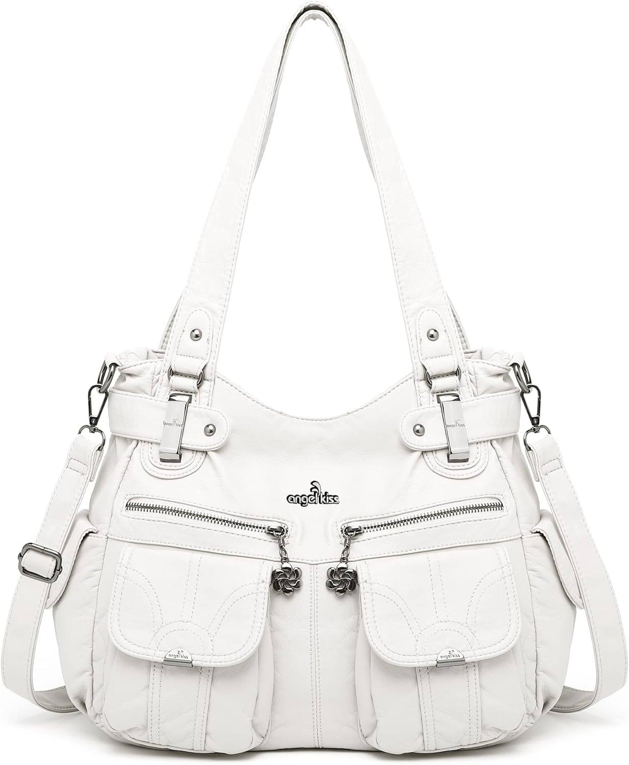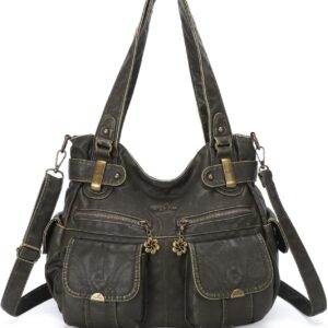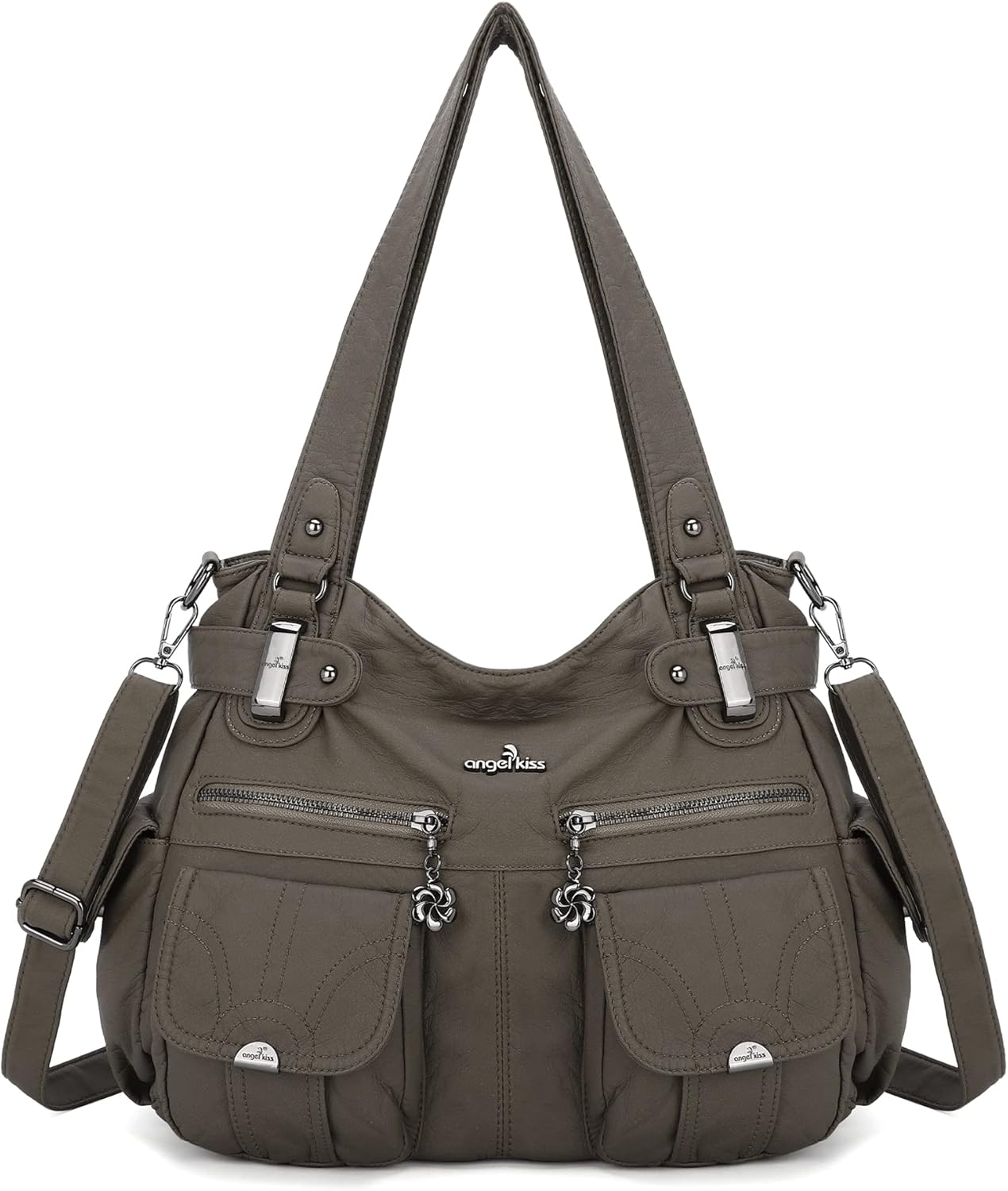 Angelkiss Women’s Designer Handbag Large Double Zipper Multi Pocket Washed Leather Purse