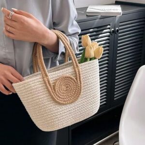 1. Versatile and Chic: This straw beach bag combines the charm of a small tote bag with the elegance of a basket bag. Its woven construction and kauna grass material give it a boho-inspired, timeless appeal. 2, Stylish and Sturdy: Crafted with durable bamboo, this mini handbag ensures longevity while remaining lightweight. Its half-moon shape and white hue makes it a fashionable choice for women. 3. Practical and Functional: This women tote handbag offers ample space to carry essentials without compromising on style. Its compact size and convenient handles make it perfect for beach outings to shopping trips. 4. On-Trend Fashion: Embrace the woven bag trend with this kauna grass bag that showcases intricate craftsmanship. It complements any outfit, making it an ideal accessory for women. 5. Everyday Elegance: Our straw beach bag is part of a curated collection of tote handbags tailored specifically for fashionable women. With its combination of versatility, style, and durability, it is the perfect addition to your accessory wardrobe.