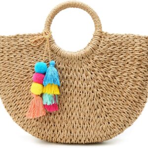 Womens Large Straw Bags Beach Tote Bag Hobo Summer Handwoven Bags Purse With Pom Poms