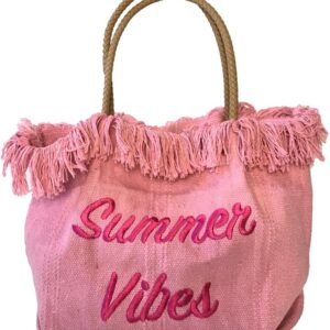 Take Summer Vibes all year long! This durable canvas tote is full of charming details with embroidered “Summer Vibes” text at front and fringe trimmed top. The large size will hold everything needed for a day outing or shopping at the farmer’s market. Curated for the Fashion Culture Resort Collection.