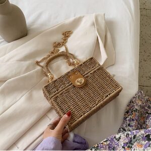 - Design: Unique square shape style design makes you look fashion, Its dainty and unique design will let you be more attractive&charming among people. And this wicker purse is designed with wooden top handle and chain shoulder strap which makes the whole bag look richer and full of three-dimensional sense.