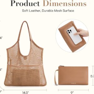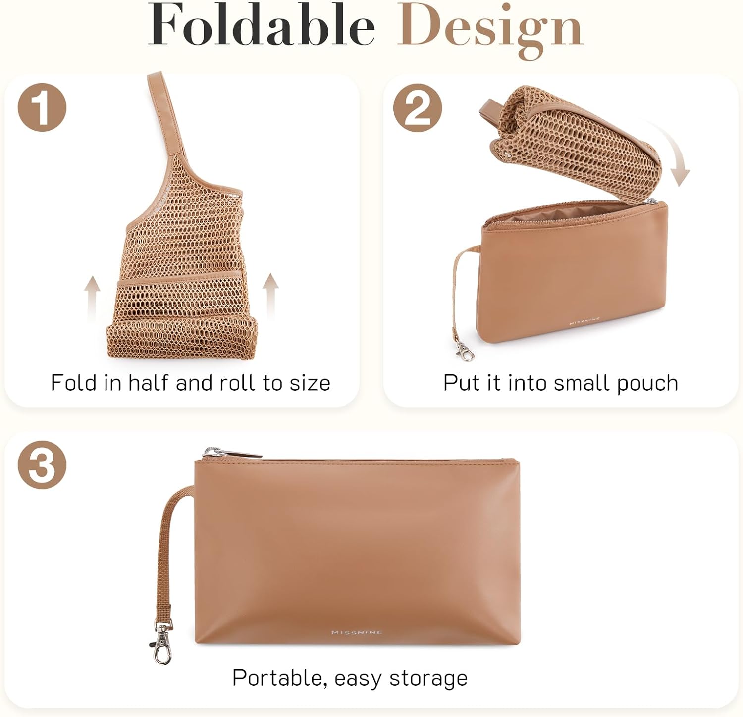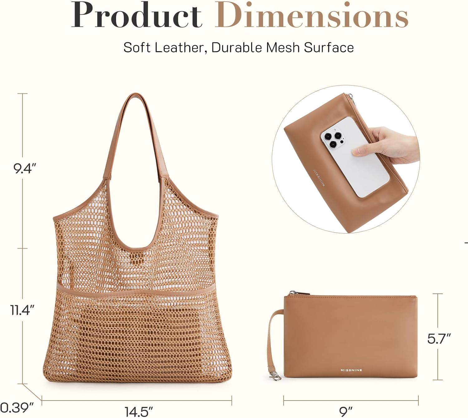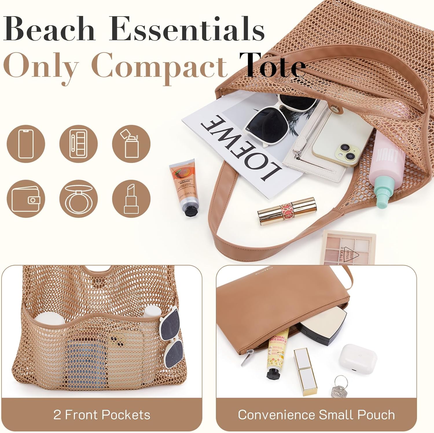 Missnie Women Mesh Beach Bag – Sandproof Foldable Summer Tote Leather Hobo Purse with Pouch for Vacation, Travel Essentials