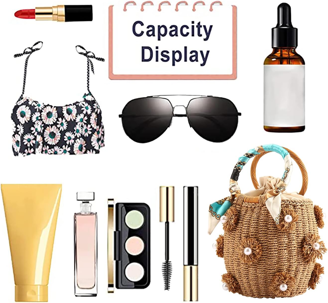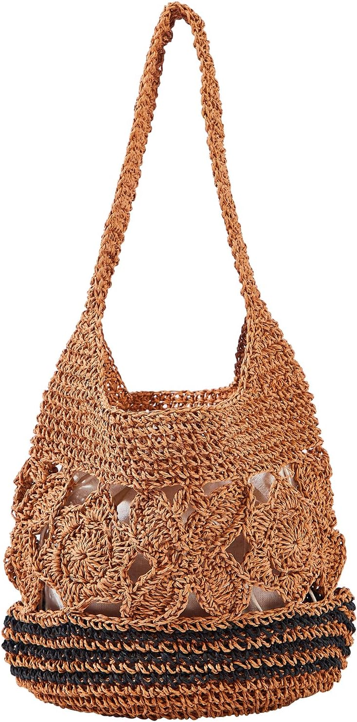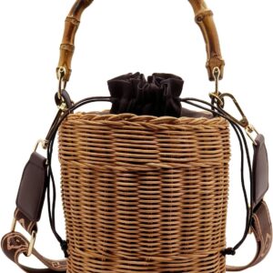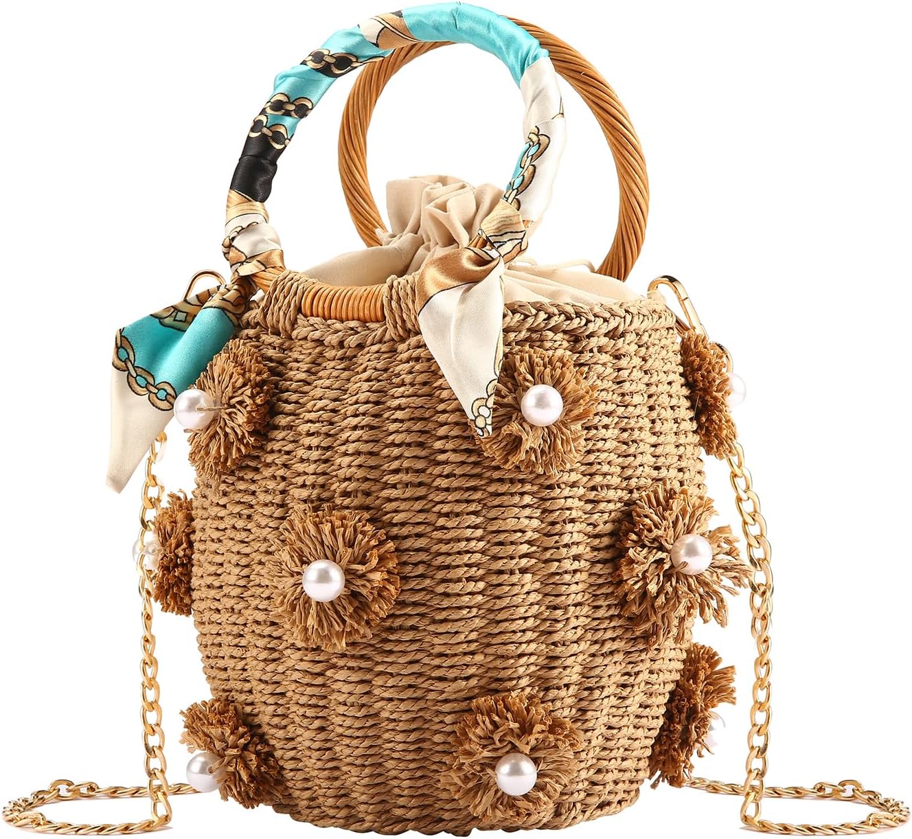 NIBD Flower Pearls Rattan Tote Bag Summer Beach Drawstring Straw Bucket Bag Diamonds Woven Handbag
