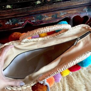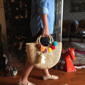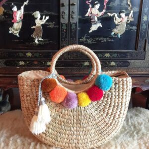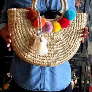 The woven market bag/straw beach bag comes complete with the shown attached colorful accessory. The Bag lined with beige textile lining ,trimmed with 6 colorful pom poms on both side of the bag and decorated with a tassel. Measurements 16.5 Inches Length (side-to-side) x 11.7 inches Height (top-to-bottom) x 5 Inches Width Handles: 6 Inches (to the top of the bag) Weight: 2 pound Material: Water Hyacinth Straw,Color Pom Pom,Cotton Fabric Lining,Seagrass Straw,Zip Closure,Colorful Tassel This delightful large straw bag with pompom detailing makes the ultimate summer accessory and works great as a beach or pool bag. It also works marvelously if you’re in need of a shopping tote for strolling the city in the summer sun. A perfect gift for yourself and anyone you love. All of our pieces are handmade with love!