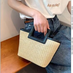 Elevate your summer style with this chic straw tote bag featuring a distinctive square handle design. The natural woven texture creates an intricate pattern that adds visual interest, while the black leather-look trim provides a sophisticated contrast and reinforces the bag’s structure. Perfect for beach outings, farmers’ markets, or casual summer days, this roomy tote combines fashion with functionality. The neutral beige color palette ensures versatility, making it an ideal accessory to complement any warm-weather ensemble. The structured design maintains its shape while carrying your essentials, and the square handle offers a modern twist on classic straw bags. This handbag strikes the perfect balance between casual and refined, making it a must-have addition to your summer wardrobe.