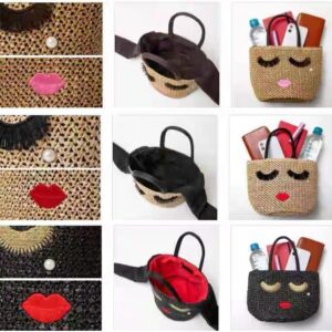 Women’s Straw Tote Bag with Eyelashes & Lips Design, Bohemian Handwoven Beach Bag, Lightweight Woven Purse with Drawstring for Picnic, Travel, Shopping, Daily Use